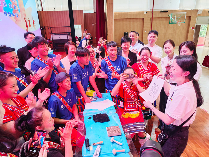 随后,台湾青少年在华侨中学师生带领下,体验了版画拓印,并与大陆学生开展旱地冰球友谊赛。