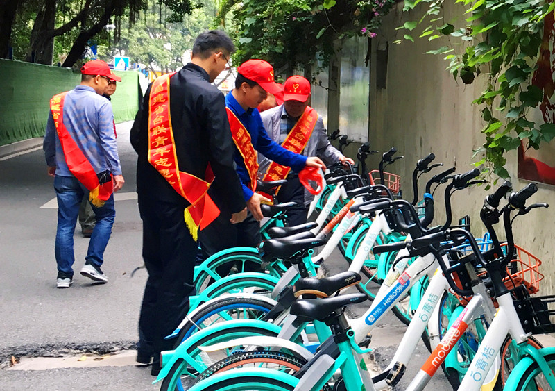 11月7日上午,省台联全体人员身披红绶带,戴上志愿帽,精神饱满地走上街头。一路上他们扶起倒下的共享单车,拾起地上的垃圾,还维护人行道上的交通秩序,沿路的群众无不投来赞许的目光。