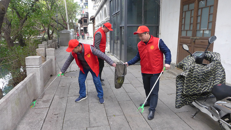 活动中,党员们来到位于鼓楼区朱紫坊的安泰河边,拾捡路边的落叶、烟头等垃圾,维护安泰河周边卫生环境。党员们还到津泰路边帮助摆齐路边的共享单车,维持公共交通秩序。
