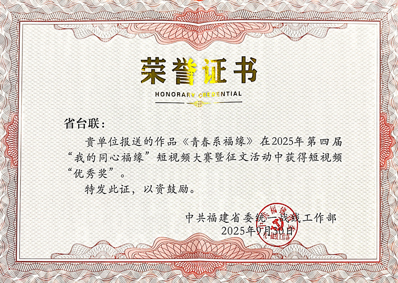日前,由福建省委统战部主办的第四届“我的同心福缘”短视频大赛暨征文活动评选结果公布,福建省台联报送的短视频《青春系福缘》获“优秀奖”。