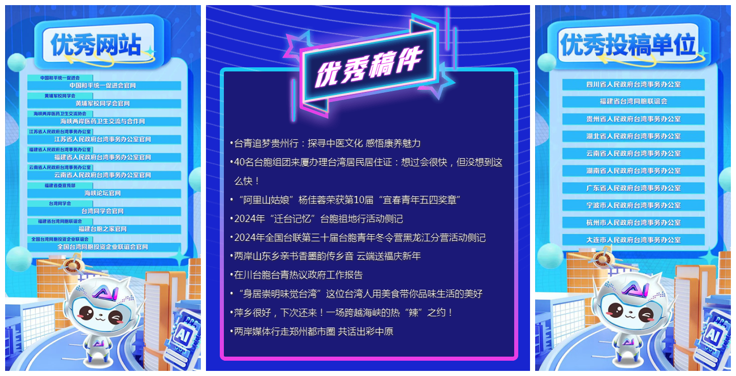 近日,中国台湾网公布“2024年度地方涉台优秀新闻作品”推选结果,福建省台联斩获“优秀投稿单位”“优秀网站”“优秀稿件”多个奖项。