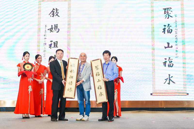 全体人员首先共同观看了《跨越海峡的妈祖缘》沙画表演,随着落沙成画,一帧帧妈祖护佑四海、福泽万民的动人画面呈现眼前。在主题沙龙环节,5名两岸社团代表围绕“妈祖文化串联两岸亲情”,进行了深入交流,他们从历史根基谈到现实归属,从个体情感说到宗亲融合,从文化传承聊到青年创新,激起了现场观众的强烈情感共鸣。台湾抗日志士亲属协进会理事长林铭聪和台中市政府前参事陈志声专门向省台联赠送了精心准备的书籍和对子“聚福山福水 叙妈祖情缘”,这不仅是两岸同胞深厚情谊的见证,更是对未来的美好期许。